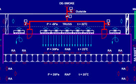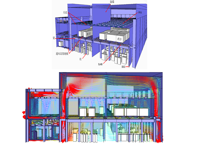 通过CFD气流模拟,配合BIM模型,整合FFU、设备布局、管线布置等调整高架地板孔板开孔率及孔板布局,控制潜在风险如气流上返、偏移;复核压差环境建立、整体气流循环是否合理等; 公司利用CFD(计算机流体力学)技术,进行计算机仿真模拟,对静态环境及动态环境下的洁净室内各种气流组织、温湿度场进行仿真模拟,取得了阶段性成果。